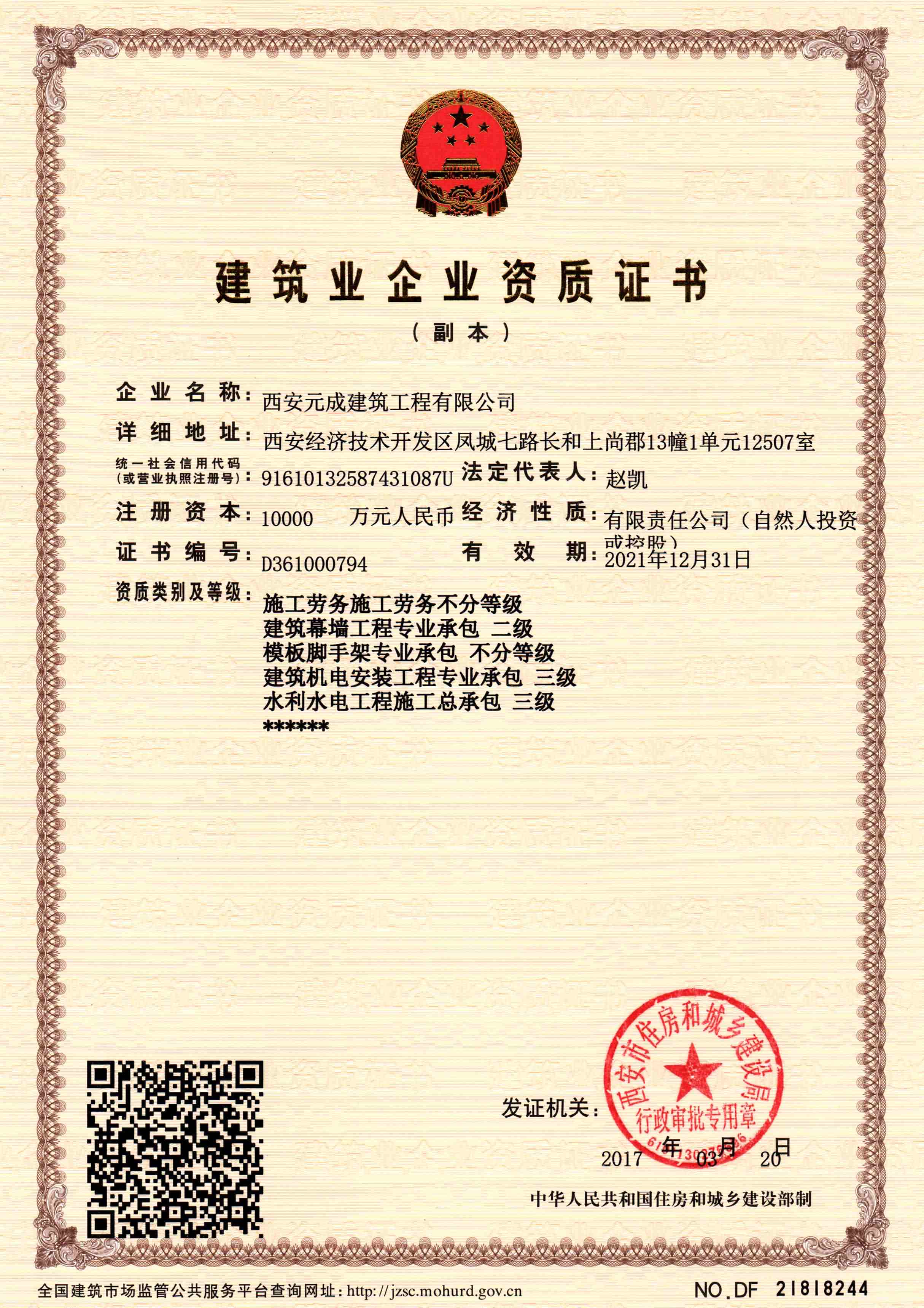Warranty repair西安元成建筑工程有限公司成立于2012年,是一家擁有建筑工程、市政公用工程、石油化工工程、機電工程施工總承包貳級;鋼結構工程、防水防腐保溫工程專業承包貳級;電力工程、水利水電工程施工總承包叁級;建筑機電安裝工程、輸變電工程、環保工程專業承包三級;模板腳手架專業承包、勞務分包等綜合性施工企業。